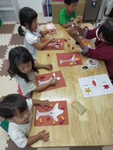 制作の時間には秋になると葉っぱは赤や黄色、オレンジ色になるんだよ〜とお話しをしました。
